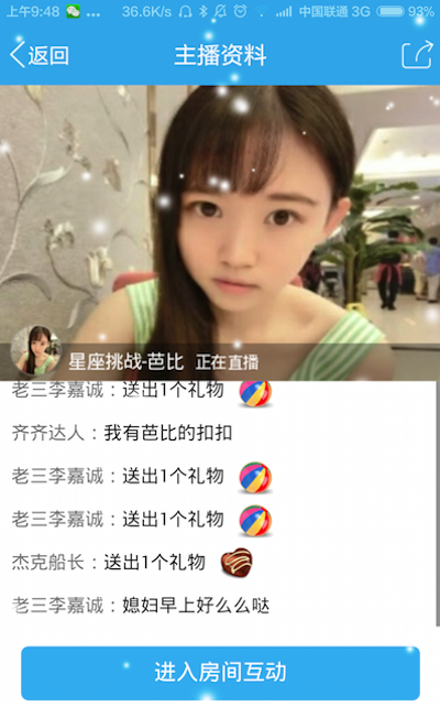 隨便選擇一個直播的房間點擊進去,PC6蘋果網小編選擇是靠前的直播房間,會顯示主播的資料,下面則會顯示有“進入房間進入互動”的按鈕: