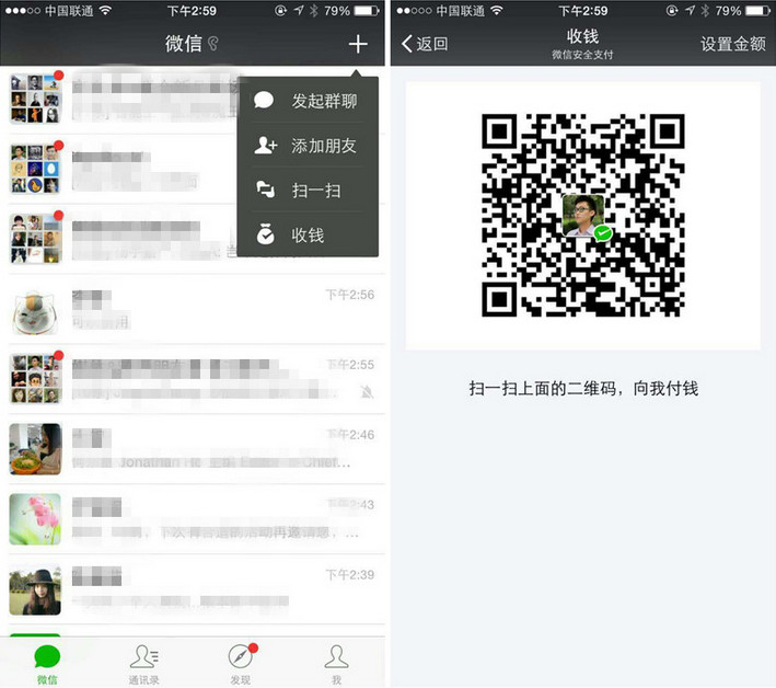 - 右上角加號中,可以通過展示二維碼來收錢。