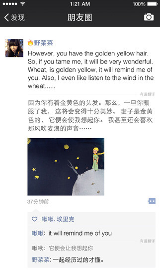 翻譯功能十分實用,在長按朋友圈中的外文狀態以後,原文內容下方會出現中文內容,供用戶參考。這一功能可謂相當貼心,適合幫助眾多普通青年看懂小眾文藝青年的生活狀態。