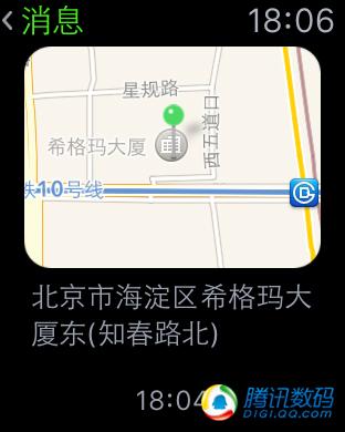 另外Apple Watch的地圖還提供了搜索功能,同樣你也不需要擔心它的輸入方式,用聽寫功能就行了,我試了一下在室內安靜環境下識別正確率挺高,只是需要手動按下聽寫的停止鍵——它不會判斷你的語義自動停止這有點傻,但可能是高德地圖的數據原因(蘋果地圖在國內用的高德數據),我說出“希格瑪”之後成功識別為“希格瑪大廈”,但卻給我導航到西安去了,好吧,我不知道西安也有一個希格瑪大廈,但是不是應該先從靠近我所在地的城市開始搜索呢?