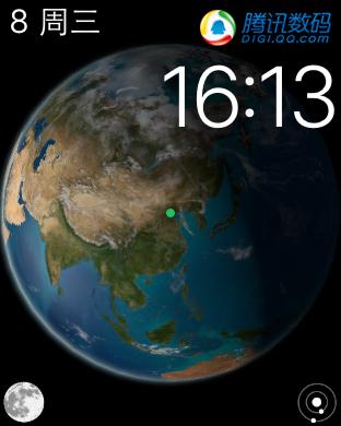 雖說10種表盤不能算多,但你還是能夠從一些細節上看到蘋果追求的是質量而非數量。比如一款名為“天文”的科技宅男型表盤,主界面就是一個帶有晨昏線的地球俯視圖,它會時刻顯示你在地球上的具體位置,還可以轉動表冠查看不同的時區(實際上是拖動了晨昏線),更酷的是你可以點擊左下角查看“飛來”的月球,更更更酷的是右下角給你提供了一個“上帝之眼”,能夠查看到整個銀河系的八大行星,通過這個表盤你能夠認識到我們自己在宇宙中是多麼的渺小……估計除了蘋果誰也不會用心去做這樣一個表盤。