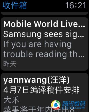 電話之後自然是郵件,雖然現在用得不多,甚至逐漸被微信替代,但有些日程和備忘錄還是得靠郵件。同樣你也不要指望在Apple Watch上長篇大論的看郵件,我試過幾種不同格式的郵件,只有普通正文的能夠百分百完全顯示,帶有表格、特殊格式或者附件的郵件都顯示不全,不過對於大多數郵件來說,看到主題也就能知道意思了,Apple Watch甚至不提供給你在手表上回復郵件的機會,而我也實在想象不到誰會在手表上敲完一封郵件。所以蘋果再一次告訴我們,Apple Watch只是一個提示和速覽的工具,更多的工作還是要交給手機完成。