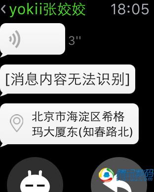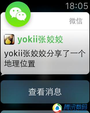 此外,Apple Watch版微信也提供了消息提醒,各種消息類型我都試了,群消息、圖片以及發送位置(不是共享實時位置)都是完美支持的,其中收到好友位置後就可以直接啟動導航,無縫切換一步到位,很屌的樣子有木有!更屌的是小視頻也能支持,只是它給拆解成了6格GIF動畫,這個,難道是我打開的姿勢不對?