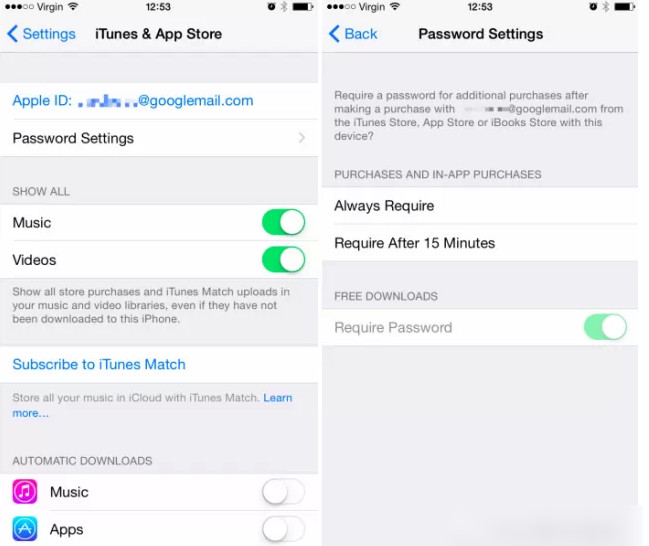 從上圖可以發現,在Apple ID選項中,允許用戶自行設置是否需要輸入密碼的時間間隔:一直需要或者15分鐘。另外最底下也提供了下載免費App是否需要輸入密碼的選項。目前App Store上的免費App越來越多,下載免費App要是不用輸入密碼,想想也是挺方便的啊!