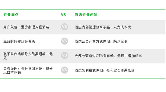 基本模式仍舊以微信公眾號和微信支付為基礎,幫助傳統行業將原有商業模式“移植”到微信平台。微信提供的“行業解決方案”中,涉及到的服務能力包括:移動電商入口、用戶識別、數據分析、支付結算、客戶關系維護、售後服務和維權、社交推廣等。以酒店為例:經濟型、商務型酒店的問題集中在服務體驗的提升和服務人力的節省。利用微信服務,將住店流程微信化減少面對面人力服務場景,優化服務體驗同時節省酒店人力。並通過微信消息能力,進行會員長期運營,激活沉默會員,增加用戶粘性。