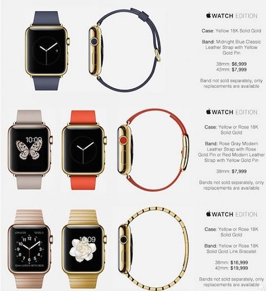 最後,幾天的重點 Apple Wathc Edition 系列以 6 款優雅獨到的風格演繹了 Apple Watch 的非凡魅力。每個表款均配備由冶金大師精心打造的 18K 金表殼,其硬度高達標准金材質的 2 倍。顯示屏采用拋光藍寶石,38 毫米 18K 黃金表殼,搭配朱紅色現代風扣式表帶,42 毫米 18K 玫瑰金表殼。很顯然,純金表殼已經屬於“奢侈品”系列,同時這價格也不是一般的親們能夠承受得起的,目前預測的 Apple Watch Edition 售價果然“不負眾望”的高,在 4999-16999 美元之間。