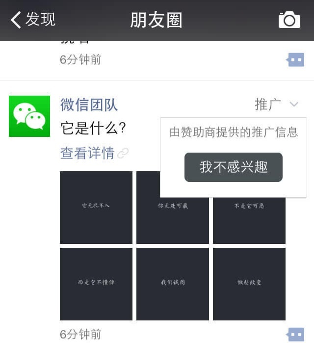 前兩天,微信iOS版正式更新至 6.1 版本,更新主要內容就是“微信搜索”功能進行了增強,不僅僅改所有聊天記錄和朋友圈信息,還將支持搜索附近的餐館。很顯然,此處是可以打廣告的!未來微信朋友圈除了“好友“打廣告之外,商家也將會占領你的朋友圈,如果說現在這個兆頭還不明顯,那麼看了今天PC6蘋果網小編為大家帶來的這則消息,你就會確信,微信將要大規模撒廣告了!而且,這些廣告會讓你無處可逃,除非——不用微信。