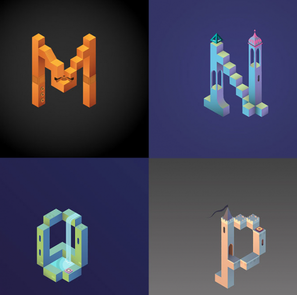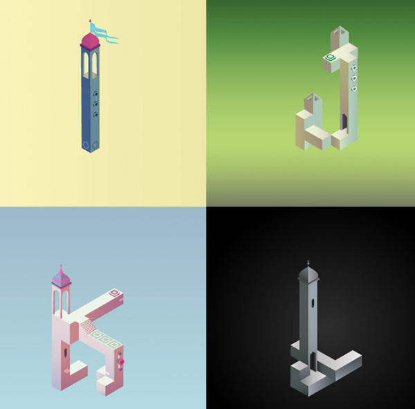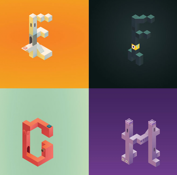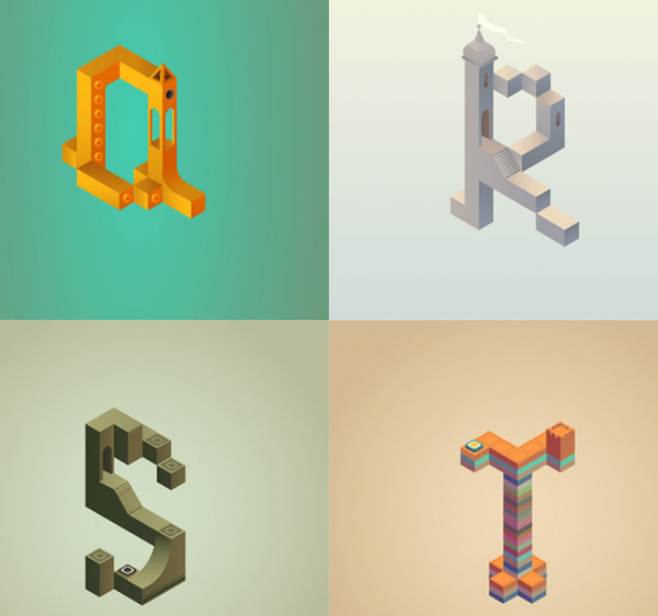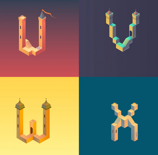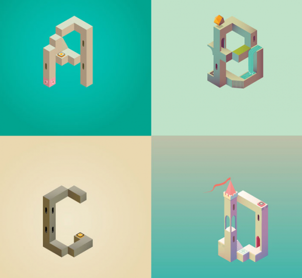 當然,一款偉大的游戲不僅僅影響玩家,還會映射到其他領域。近日,巴塞羅那的平面設計師Claudia Mussett受到該游戲的啟發,設計了一套《紀念碑谷》風格的字母表Alphabet Valley,該字母表融合了游戲中各種讓人產生錯覺的建築元素。設計師Musset表示,十分熱愛《紀念碑谷》的藝術風格,稱贊其是有美感的游戲。