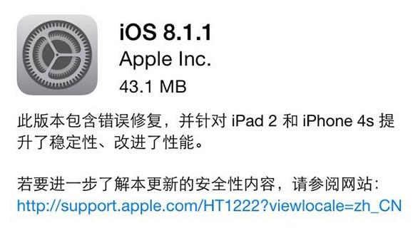 北京時間11.18日凌晨,美國加州當地時間11.17上午,蘋果公司正式公布 iOS 8.1.1 系統,根據跟官方的更新描述成 iOS 8.1.1 正式版對 iPhone 4S和 iPad 2 性能有顯著提升提供對系統,在流暢度和響應速度方面得到進一步的加快。同時 最新的 OS X Yosemite 10.10.1也得到了更新,網友們可以直接在手機通過軟件更新來升級,對 iPhone 4S 和 iPad 2來說更新包不大僅就幾十MB,但是對iPad來說就比較龐大了三百多MB,小編估計應該是增加了代碼封堵了越獄漏洞。