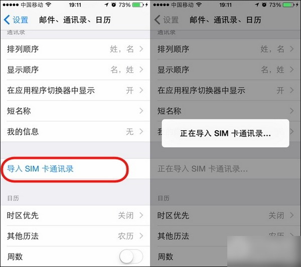 通過上述工具同樣可以實現通訊錄的導入。但在ios8以及iPhone中,我們更多的時候會采用如下的方法:依次進入“設置-郵件、通訊錄、日歷”界面中,拖動屏幕到下方找到並點擊“導入SIM卡通訊錄”文字鏈接,這樣就可以把原來存儲在SIM卡中的聯系人全部導進來了。