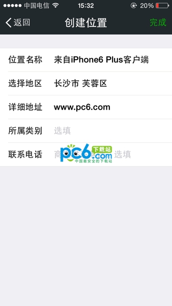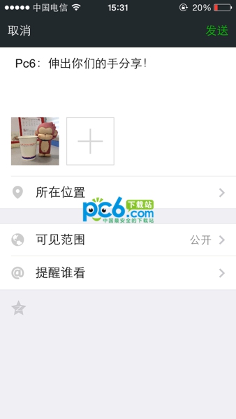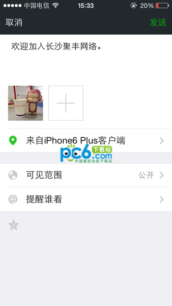 添加 iPhone 6 和 iPhone 6 Plus 尾巴的方法很簡單,你在微信朋友圈發消息的時候是可以編輯所在位置的,如下圖所示: