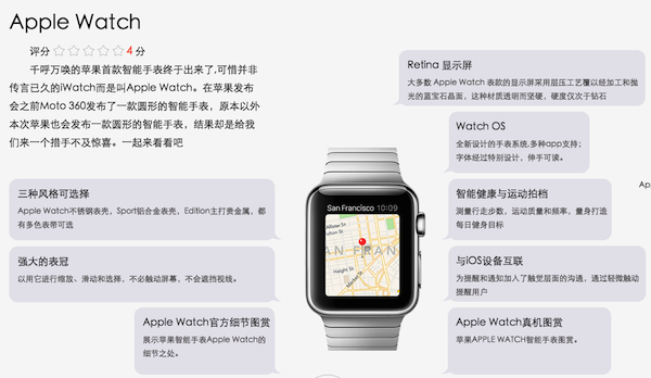 Apple Watch的設計並沒有太多的驚艷感覺,與傳統腕表相似,不過在機身的側面設計了一個旋鈕和一個按鍵,受限於屏幕尺寸,Apple Watch將很多觸摸操作搬到了側面的旋轉鈕上,使用中可以通過旋轉旋鈕完成縮放、上下滑動等操作。而蘋果為了照顧佩戴者的喜好,推出了一大一小兩種屏幕尺寸的Apple Watch。