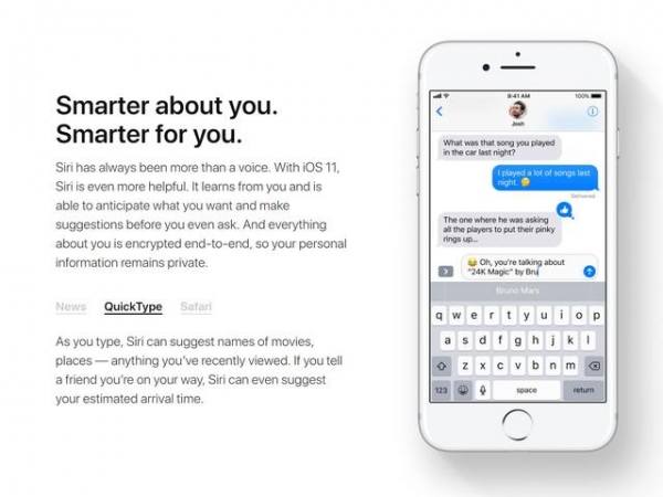 Siri 現在能夠借助智能機器學習,主動判斷你接下來的動作,以及可能用上的功能,比如在浏覽器中查看過某個旅游目的地,Siri 會適時的在聊天、搜索框鍵盤候選字中顯示相應的名字。