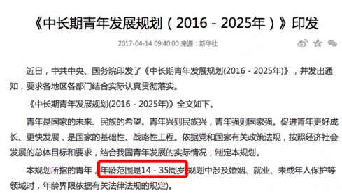 再有,中共中央、國務院印發的《中長期青年發展規劃(2016-2025年)》中,本規劃中對青年的定義又有不同。本規劃所指的青年,年齡范圍是14-35周歲(規劃中涉及婚姻、就業、未成年人保護等領域時,年齡界限依據有關法律法規的規定)。按照此規定,1982年生人還可以過今年的青年節。