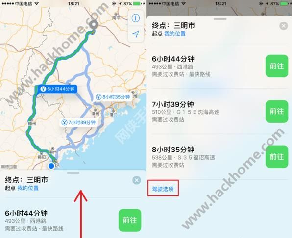 1.打開地圖App,我們先搜索要到達的目的地,搜索後點一下“路線”進行路線規劃,路線規劃完成後,在地圖下半部有個拉桿往上拉,點擊“駕駛選項”,就可以設定是否需要避開收費站或者高速公路!