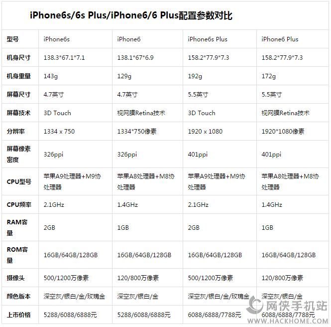 從表格中,我們可以看出,iphone6s和iPhone6,iPhone6S Plus和iPhone6 Plus雖然屏幕尺寸一樣,但是分辨率不一樣。iPhone6S/6S Plus分辨率為1920×1080,而iPhone6/6 Plus分辨率只有1334×750。硬件上,iPhone6S/6S Plus采用了更新更快的蘋果A9處理器,而iPhone6/6 Plus是A8處理器。iPhone6S/6S Plus的運行內存為2GB,iPhone6/6 Plus的運行內存只有1GB。