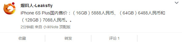 現在,@爆料人-Leaksfly又曝光了iPhone 6S Plus國行版的售價,16GB版為5888元,64GB版為6488元,而128GB版則是7088元。