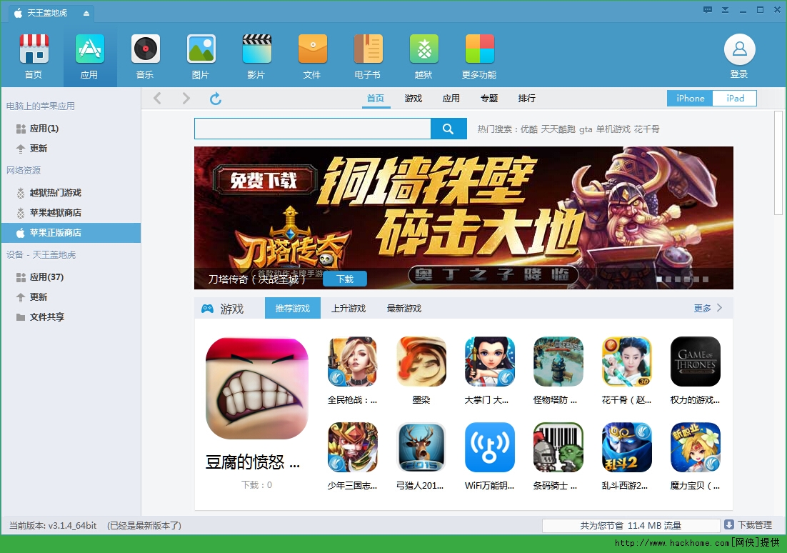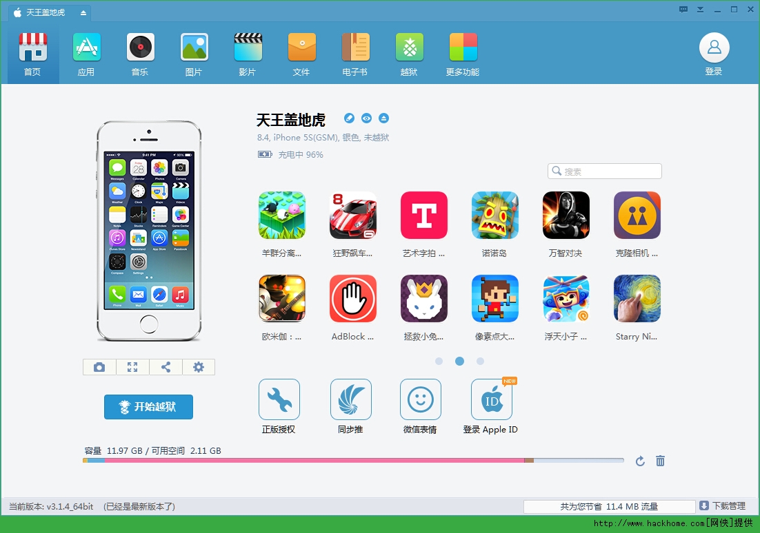 1、在“首頁”菜單中,我們連上自己的iOS設備,可以看到自己是設備相關信息,如iOS系統版本,手機信號及顏色還有越獄情況,當然還支持截屏管理和游戲搜索及下載等多種功能。