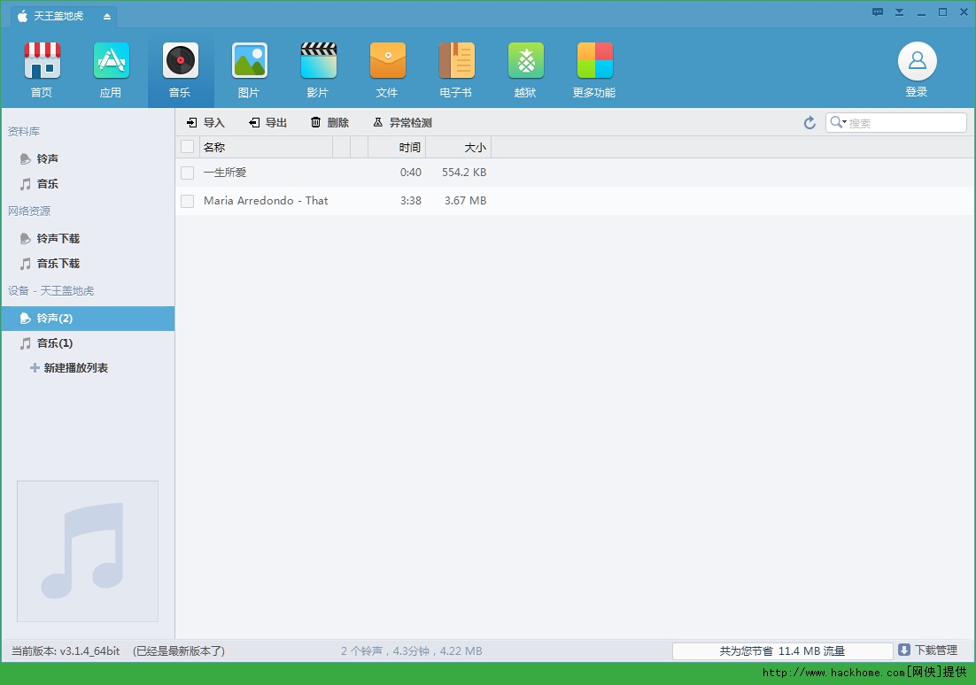 3、在“音樂”菜單中,我們可以對音樂進行下載管理還可以對鈴聲進行制作,這樣就大大的方便了iOS未越獄用戶的制作自己喜歡鈴聲的步驟了。同步推,在鈴聲制作方面非常出色~