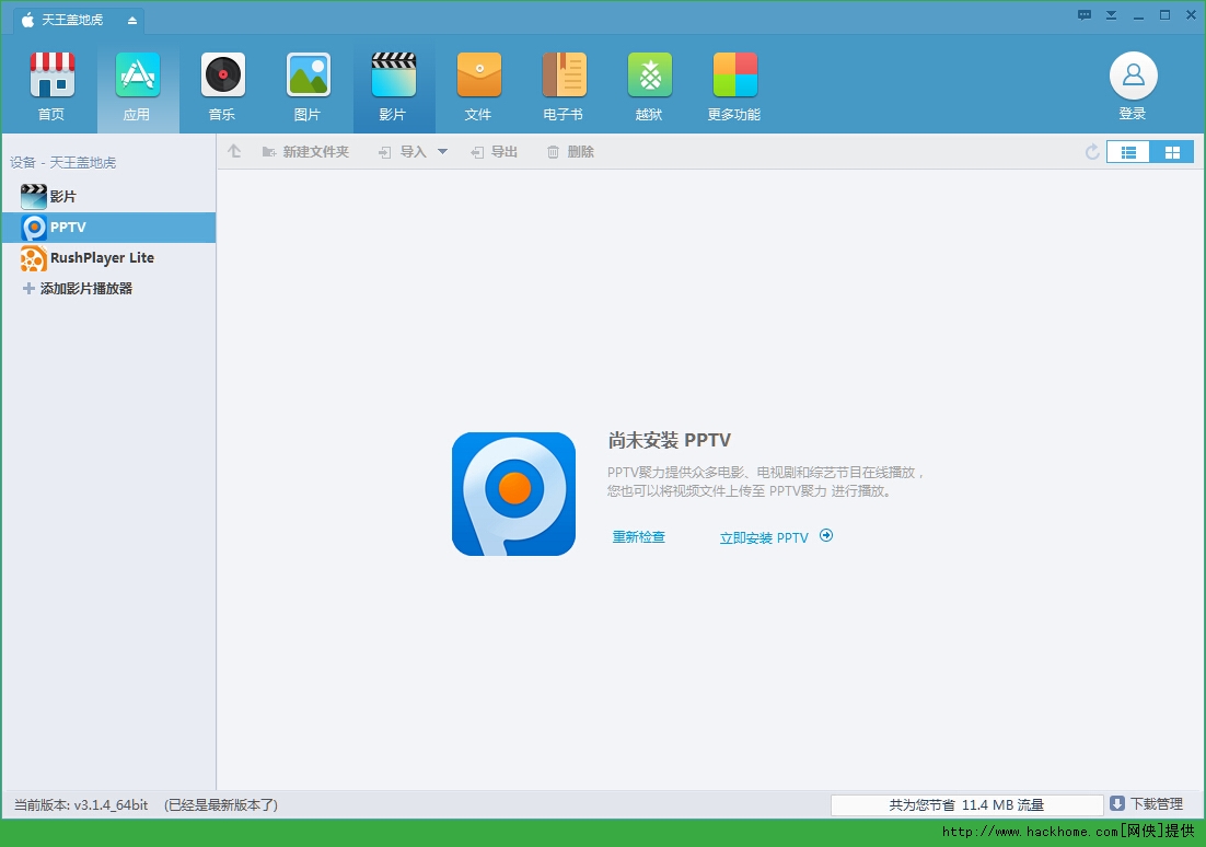5、在“影片”菜單中,用戶可以看到,可以將本地的視頻進行導入,也可以下載軟件自薦的app進行一鍵安裝,同步推,在影視導入方面也非常不錯~