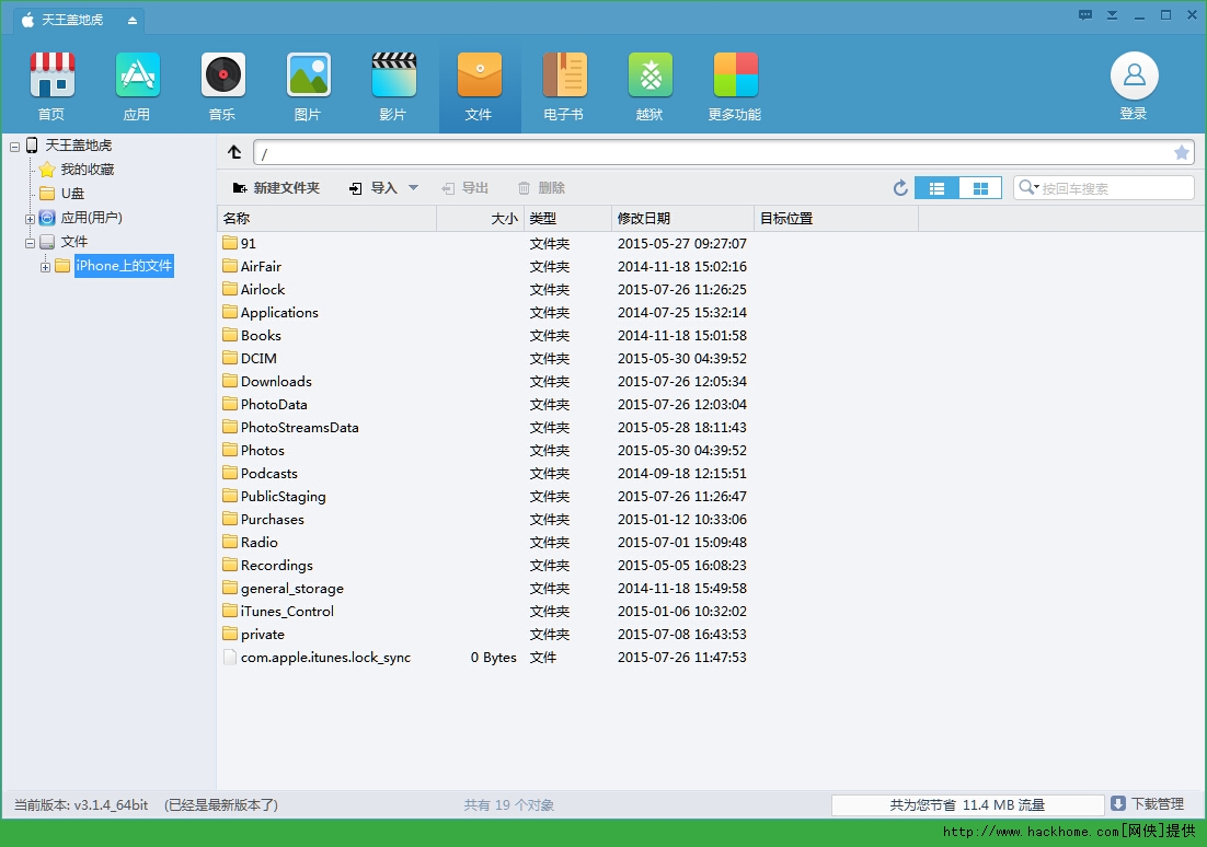 6、在“文件”菜單中,該軟件可以讀取iPhone中的文件夾,當你有什麼破解游戲和破解應用的存檔文件需要導入,和修改某些文件的屬性的時候,同步推,在這方面就表現得非常不錯了~