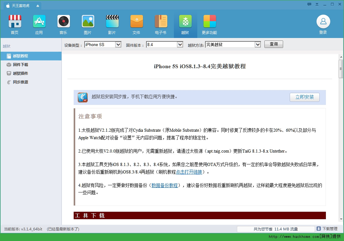 8、在“越獄”菜單中,我們可以看到同步推的強大之處,該軟件支持iOS系統一鍵越獄,而且現在還支持ios8.4版本哦,還在為越獄而煩惱的童鞋,同步推是一款不錯的越獄選擇哦~
