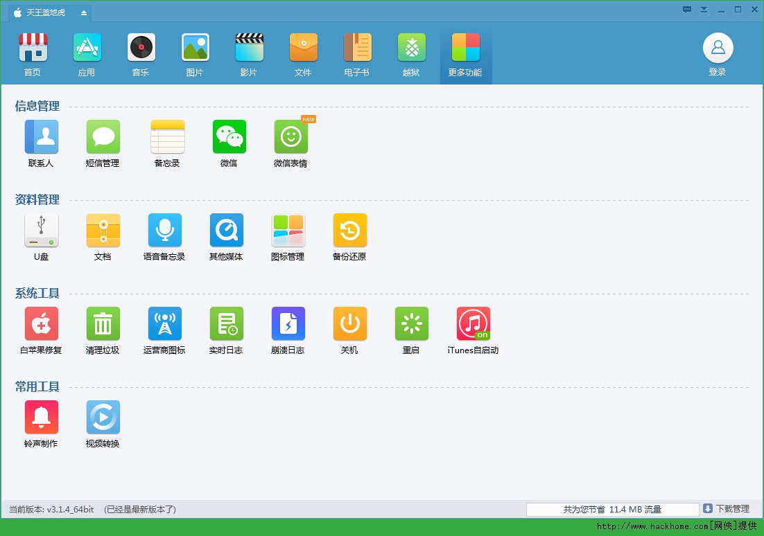 9、在“更多功能”菜單中用戶可以對聯系人、短信、備忘錄、微信、文檔等進行一鍵管理,該功能中包含了信息管理、資料管理、系統工具、常用工具等,總有一款是你需要的!