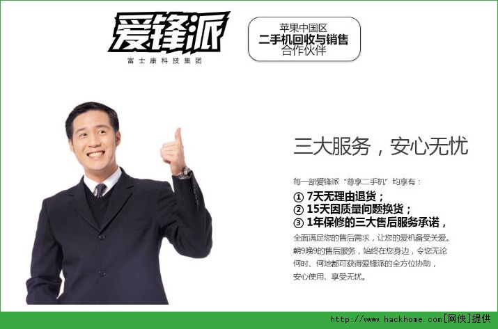 首先,我們可以知道,愛鋒派是蘋果中國區二手手機回收與銷售合作伙伴,它為用戶提供“三大服務,安心無憂”