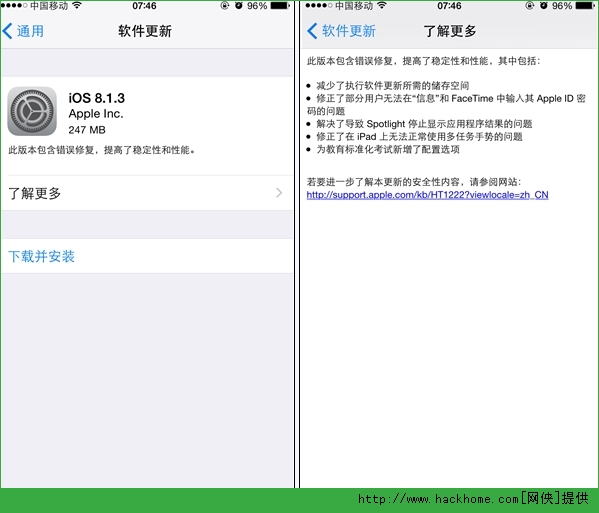 關於iOS 8.1.3減少了系統更新時所占用的存儲空間。雖然沒有具體說明,但對於16GB版、應用狂人、影音愛好者來說無疑是個福音,不必再擔心升級時提示空間不足了。