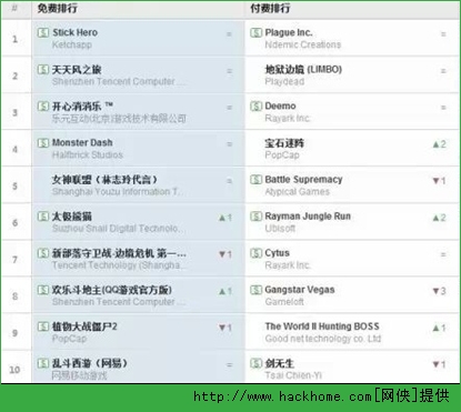 免費榜上,排行第1較長時間的是《英雄難過棍子關》,該款游戲被蘋果推薦為本周優秀新游,小優姐簡單體驗了下,有點類似《flappy bird》那樣的虐心小游戲。排位第4的《Monster Dash》是風靡一時的游戲《水果忍者》開發商研發的一款跑酷新游。排位第7的是騰訊的塔防新游《新部落守衛戰》。