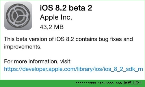 今天蘋果向開發者們推送了ios8.2 beta2版。此次蘋果並沒有列出 iOS8.2 Beta 2 的更新日志,只注明“包含漏洞修復和性能改善”。同時蘋果還表示,本次更新僅僅是針對已經安裝了 iOS8.1 Beta 1 的開發者開放。