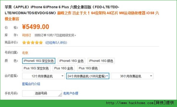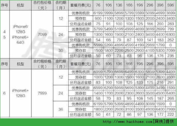 目前,外界普遍認為購買意向較高的64G版iPhone6及iPhone6 Plus,分別只要預存6299元,選擇24個月合約的596元套餐,或預存7099元,選擇30個月合約的596元套餐,即可0元購機。