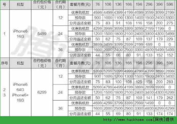 從圖中可以看出,如果消費者想0元購機,無論是哪個型號、版本的iPhone,都必須至少選擇24個月及以上的合約套餐,其中,選擇24個月的596元套餐,並分別預存5499元和6299元,即可實現0元購買16G版iPhone6和16G版iPhone6 Plus。